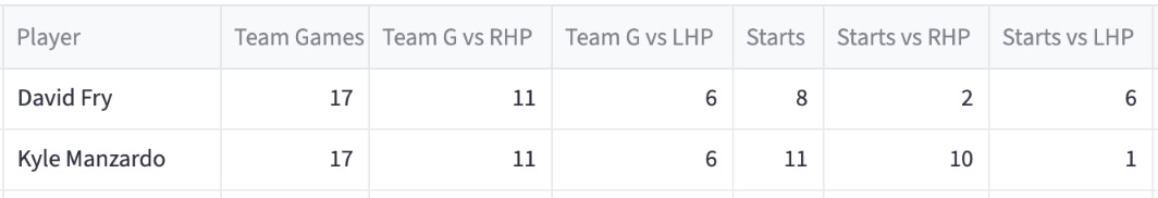 The first thing we’ll do for each team is give the last two weeks lineup grid. These are updated daily and available to subscribers in this resource, found in the Resource Glossary: