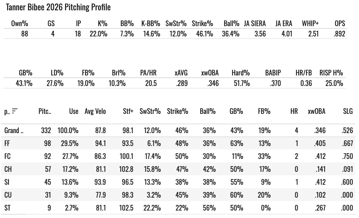 He will be better. Something we like to look for are decent K-BB% with high xwOBA allowed. xwOBA stuff for pitchers tends to regress. Bibee’s 15% K-BB% is fine. Not really 10-team worthy, and really Bibee hasn’t been a 12-team guy since 2024. So he’s probably on the fringe. He’s someone you can bail on in a shallow league for the Noah Schultz-type call-up. I don’t know if I’d have done that one specifically, but you get the point!