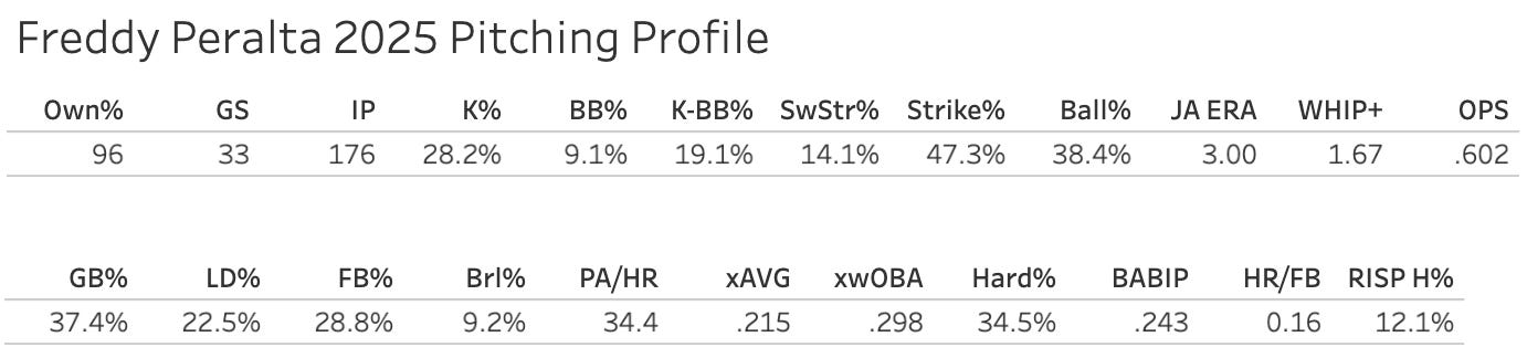 Next on the projections is Freddy Peralta. The Cubs aren’t a super intimidating lineup at this point. Kyle Tucker did not have an extra base hit in the Wild Card series. He hasn’t homered since September 2nd, but he did miss most of September on the IL. I haven’t given Peralta the respect he deserves. He put up a 2.70 ERA this year on a 28% K%.