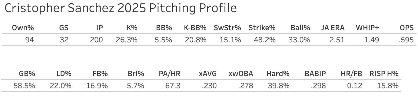 The model hasn’t been fully in love with Cristopher Sanchez too often this year. That’s mostly because of a lower 26% K%. But a 5.5% BB% and a 59% GB% make him one of the elite run-preventers.