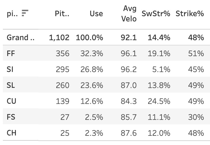 He ended up with a 26% K% and a 5.5% BB%. That’s a 20%+ K-BB%, and it got him the game one nod for the M’s. He had a 2.82 JA ERA at home and did have better results there. He took the four-seamer to a new level this year.