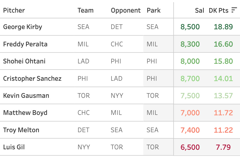 George Kirby leads the pack. He has the best matchup. I think you would have to say the Tigers’ lineup is the worst one remaining. Kirby did not have his best season of work, but he finished very strong.