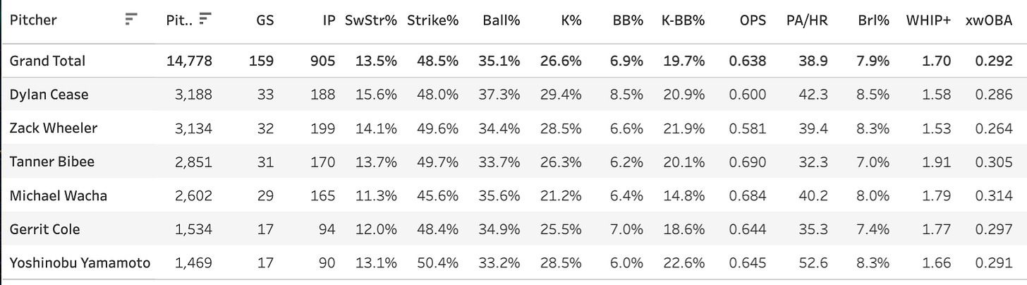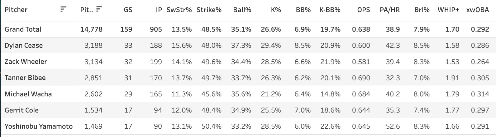Yoshinobu Yamamoto: 17 GS, 1469 Pitches, 28.5 K%, 6.0 BB%, 13.1 SwStr%, 50.4 Strike%, 33.2 Ball%, 48.3 GB%, 8 Brl%