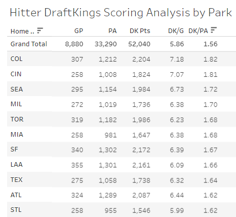The league average DraftKings points scored per plate appearance for hitters is 1.56. In Coors Field, it is 1.82.