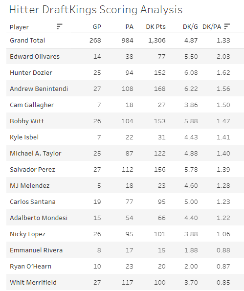 I am certainly fine with playing Merrifield as the lead-off hitter for a cheaper price tag given his crappy performance so far this year. That seems to be pretty sharp, but the upside is always pretty low with him given his inability to hit homers. You’ll need multiple hits and a steal to get a huge number out of him (he doesn’t have a single 20 DraftKings points game this year).