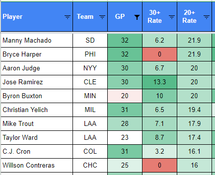 Speaking of big DraftKings points games, here’s a look at the 20+ point performance rate leaders this season. Paid subscribers to this substack have full access to this data, which includes many more columns I’m not displaying here.