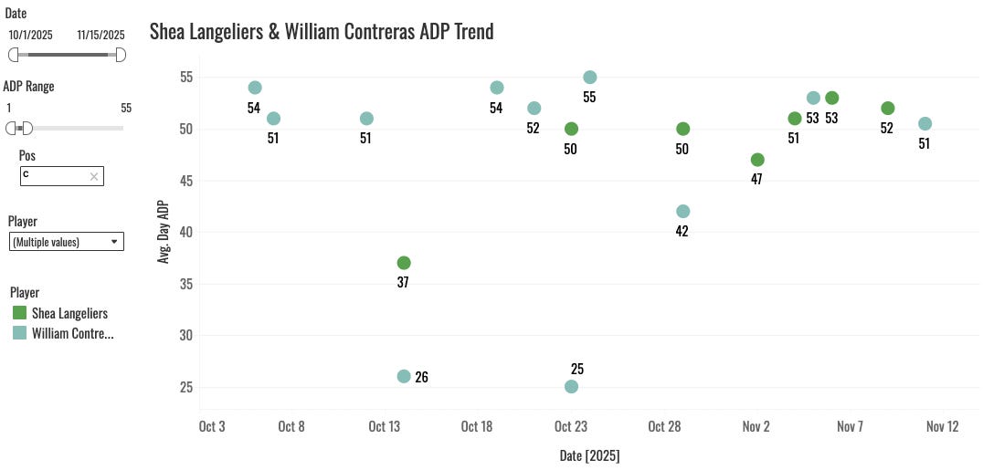 Catcher ADP varies by league type. You can probably bump most of these guys down significantly in your standard one-catcher leagues. I doubt anybody in your ten-team league with your high school buddies will be pulling on William Contreras in the top 50 picks.