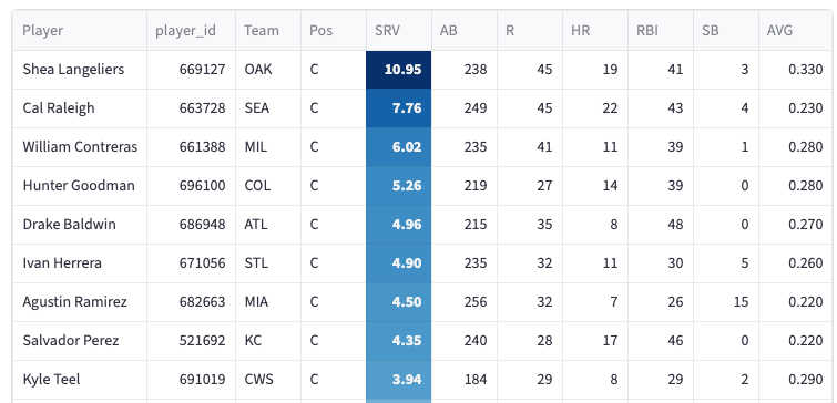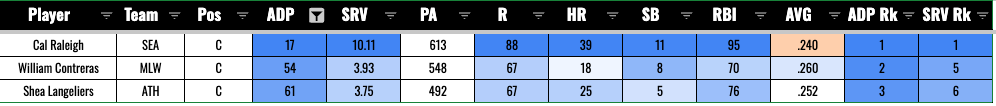 To Langeliers’ credit, he was better than Raleigh in standard roto in the second half last year. The dude hit .330 after the All-Star break and came within three homers of Raleigh. So 100 points of batting average more with very similar production everywhere else.