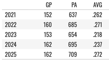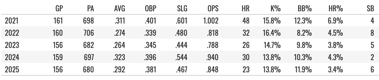 For all of Vlad’s proven-ness, though, he’s usually fallen well short of top 20 production. Even in this wildly successful 2025 season he’s coming off of, he hit only 23 homers and stole six bases. That’s something you can replace extremely easily. The reason you draft Vlad is for the batting average, on-base percentage, and the counting stats that he accrues. He scored 96 times and drove in 84. But he’s maxed out at 32 homers since that 2021 season, which now looks very strange.