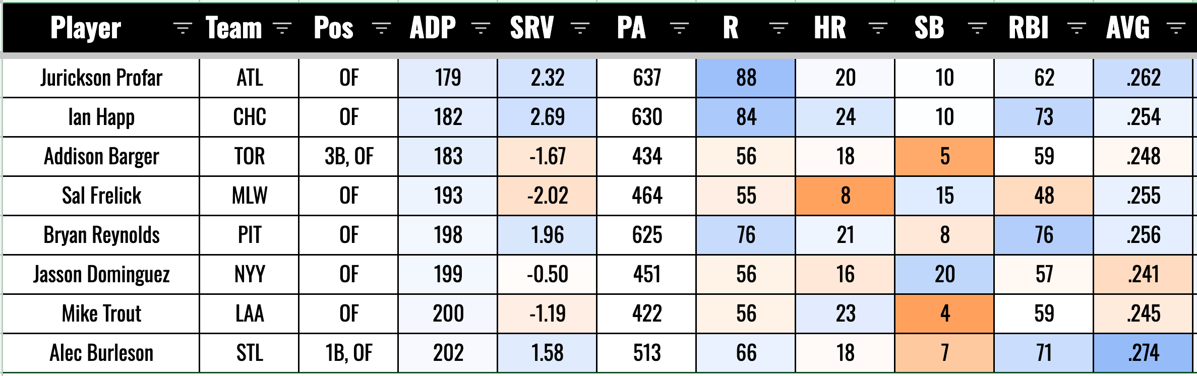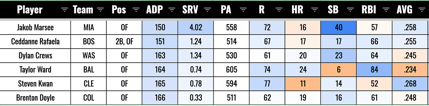 I went over Jakob Marsee in the Marlins preview, which will be out soon. My model is crazy high on him. So much so that I’ve had to cool it down manually. But the guy makes contact, has some power, and steals a bunch of bags. The raw skills make me think my projection will still end up being much too high, but this is where it lands. And drafters are pretty interested in him as well, with a top 150 ADP.