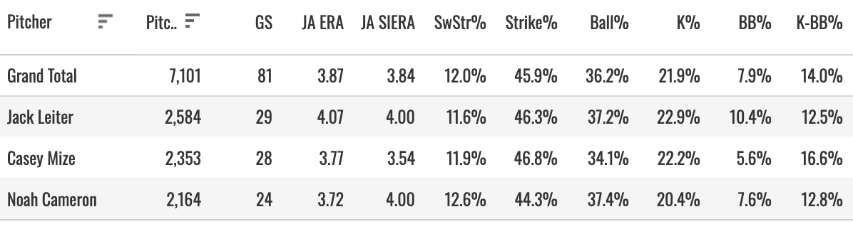 JACK LEITER might have some of that upside, but a double-digit walk rate and 38% GB% make him a super volatile guy that can do a lot of damage to fantasy squads in a hurry. He does have a big fastball, which is always nice to build off of. But the secondaries have been garbage to this point.