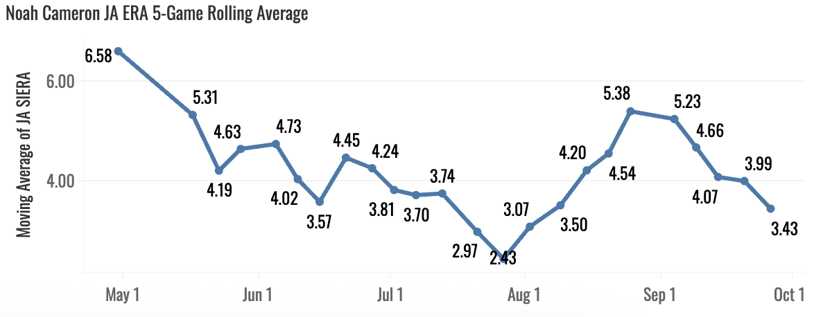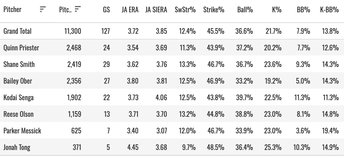 CASEY MIZE, man! He’s back again. The guy had the best K% of his career (by a good margin) but still reached just a league-average mark of 22.2%. His 1.3 HR/9 and lack of anything good in the pitch besides the splitter took him to a poor 4.02 ERA with the 3.77 JA ERA. If you’re looking for volume guys that can get outs in the Majors, he’s a good option. But he is certainly no upside option.