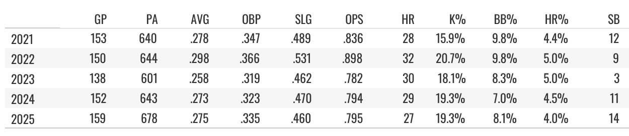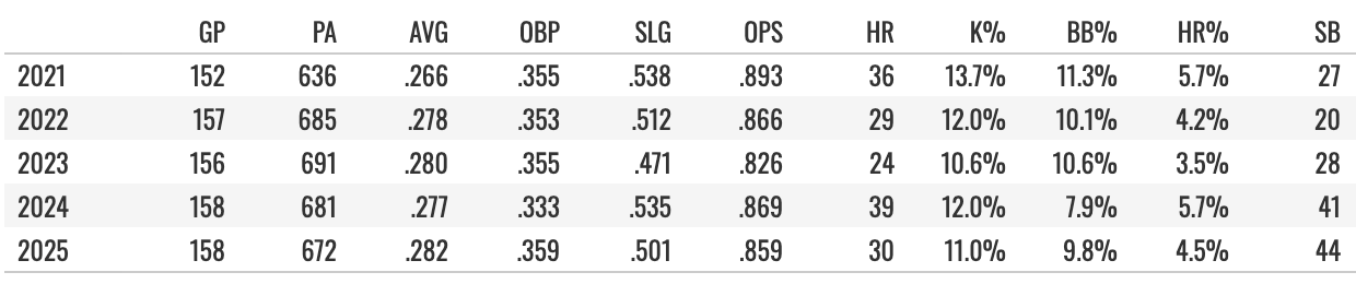 Manny hasn’t had a first-round type of fantasy season since getting into a Padres uniform. But he’s also never had a bad season. He’s in there hitting around 30 homers and steals some bags with a good batting average every year. And he holds up really well, having played at least 138 games in each of the last five years, going for 150+ in the other four.