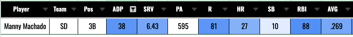 We have small tiers early on. Machado is on an ADP island at 38. The next guy is around 30 picks later, so I have to leave Machado in his own tier.