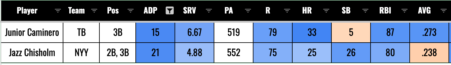 As for Jazz Chisholm, he’s one of the best HR+SB guys in the league. The guy has 42 bombs and 49 steals in 176 games as a Yankee. He’s a roto stud. But there is some serious batting average downside. His K% reached 28% last year, and that’s a bit of a worry. He could definitely be a guy who ends up hitting .240 and hurts you there. But the HR+SB plus good team context for R+RBI makes him a comfortable enough second-rounder.