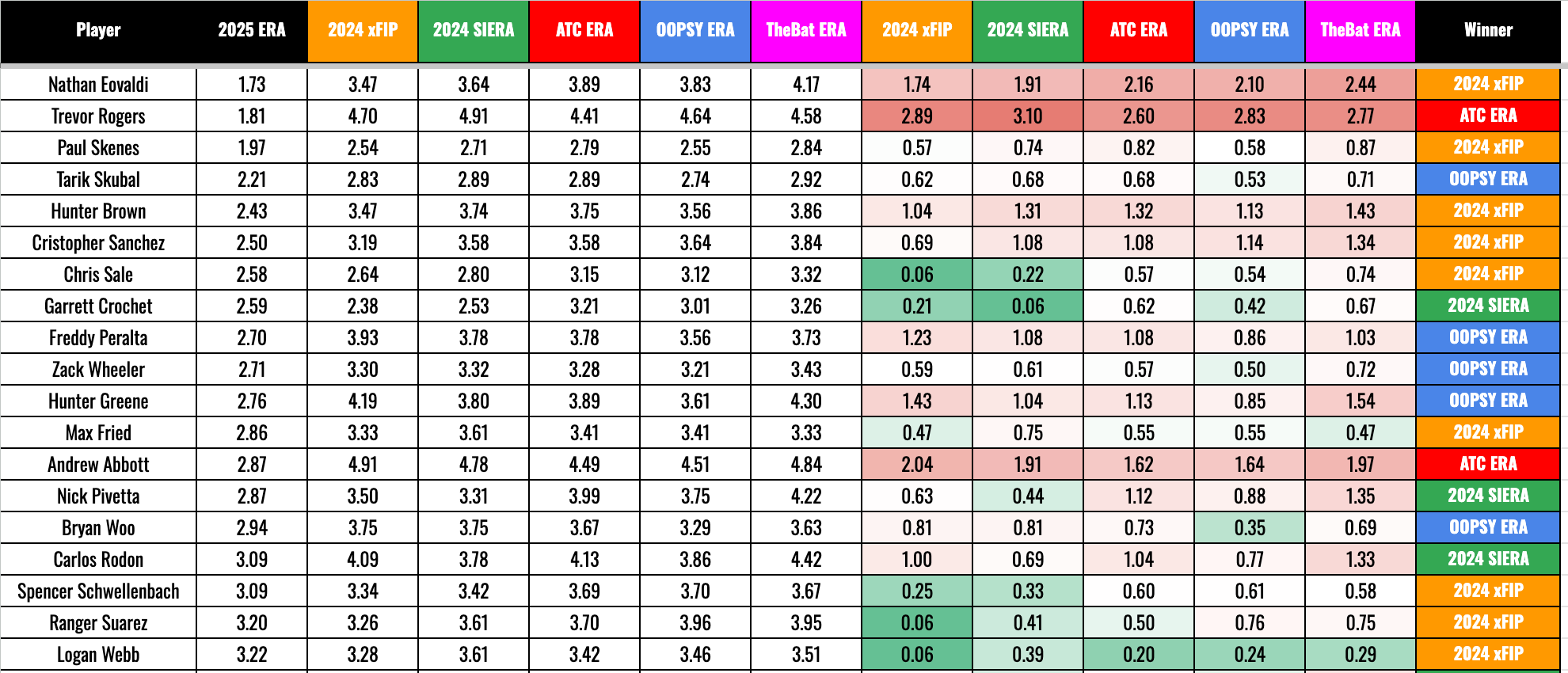 For point one, The Bat actually had the most wins. It was closest on the most players in the sample (relatively small, by the way), but the average error was worse. Apparently, Derek is finalizing the Bat X pitcher projections. That’s been in the works for years, so those will very likely be more accurate than The Bat. He’s agreed to come on a podcast with me in a week or two to talk about it.