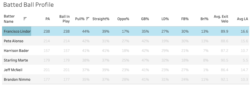 His 44% Pull% is strong, although on fly balls it does drop to 21%. But when he gets the ball in the air, he impact it well with an average exit velocity of 94mph).