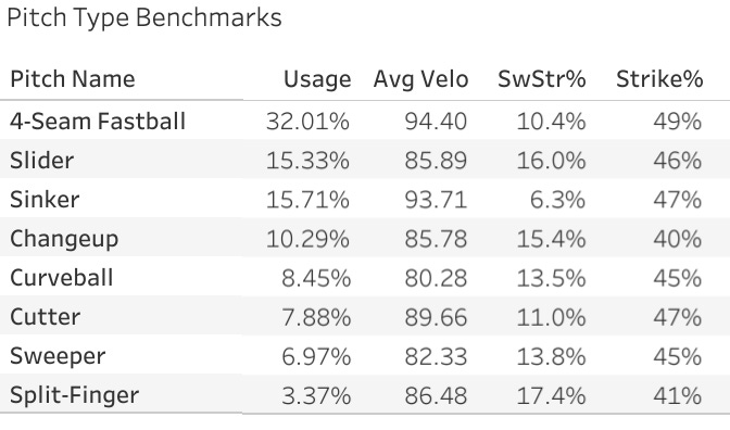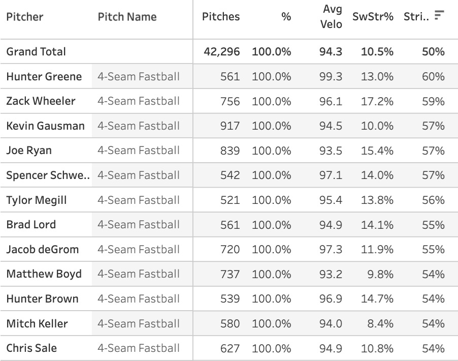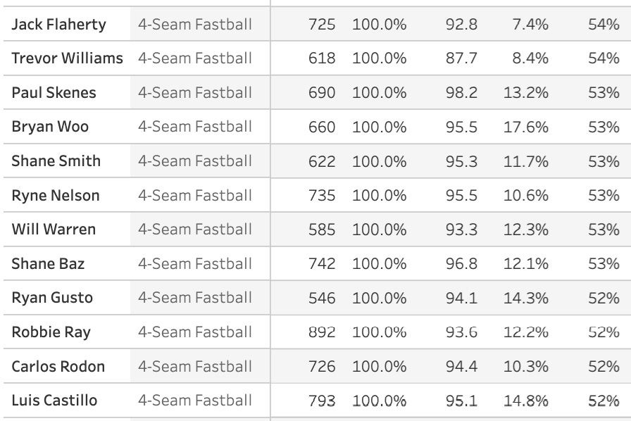 Before we get started, we also want to know what’s good. The league average Strike% on a four-seamer is 49% this year.