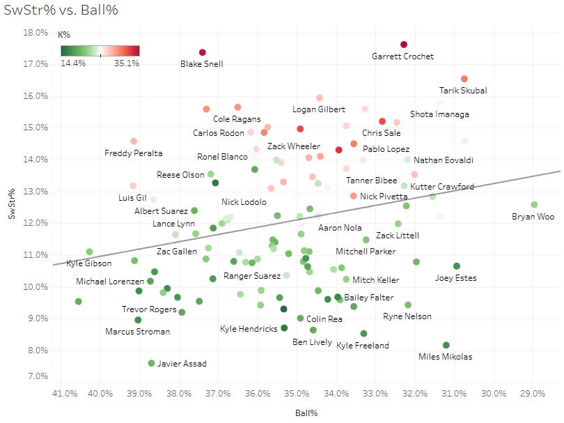 When you find a pitcher doing these two things at the same time, what you find is a guy with good stuff and good command. Since SwStr% is highly correlated with K%, and Ball% is highly correlated with BB, we aren’t far away at all from just having a K-BB% list. But this is a little more fun, and it’s a little more useful when we have smaller data samples because these two statistics are built at the pitch level, while K% and BB% are built at the plate appearance level. So, for every batter faced, you’ll get one data point going into a K-BB%, but on average, you’ll get around four data points going into SwStr% vs. Ball% (because the average pitches seen per plate appearance is around four).