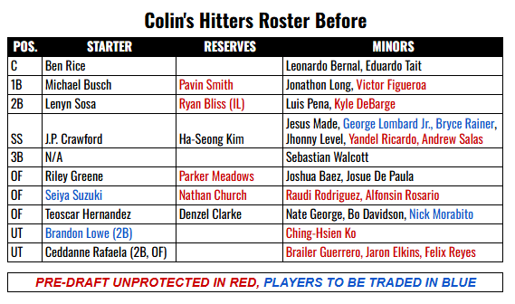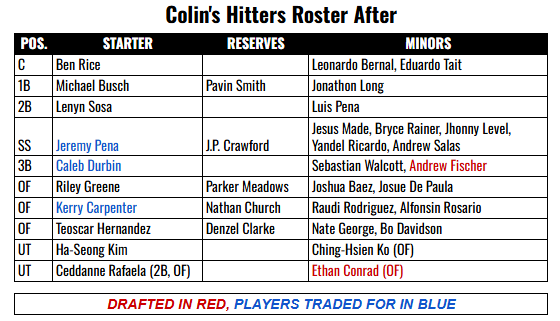 Colin, who has been playing fantasy baseball since 2016, had a team in fourth place in the middle of the season until the wheels came off. He did the smart thing, dealing away parts for prospects, landing two of the best teenagers in Jesus Made and Sebastian Walcott, and finishing 10th of 20 teams.