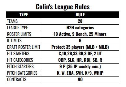 This year, the goal is a top-five finish. With these categories in a head-to-head categories league, including a Rule 5-like protect and/or pillage draft before the FYPD, it’s a little complicated.