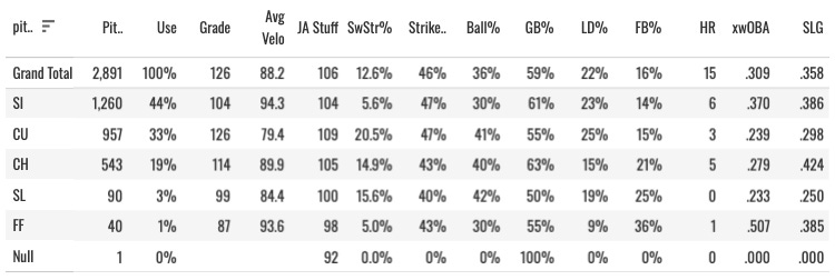 He gets enough whiffs (12.6% SwStr%) and throws enough strikes (35.6%) to be consistently good and not be a Jose Soriano type, where things go really badly from time to time because he’s walking guys and not cleaning up the mess with the strikeout.