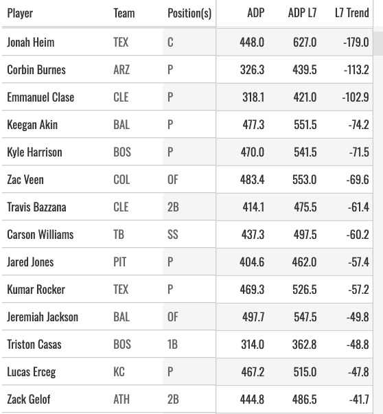 Jonah Heim was CUT. Corbin Burnes is falling as people realize he’s not going to be in the rotation until at least July. Emmanuel Clase is going to prison. And that’s by far the coolest reason to see your ADP fall, right? Class was going around picking 318 early on, and then he was like Hey, yeah, I’ll prob be tied up next year. He’s still going at 421.