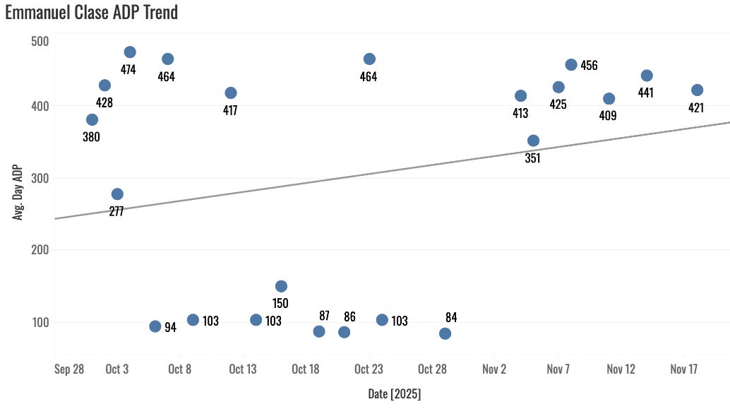 Actually, that’s not true. Because if he doesn’t get drafted, the ADP doesn’t change. He hasn’t been drafted since November 18th.