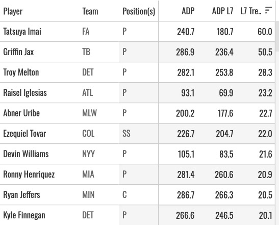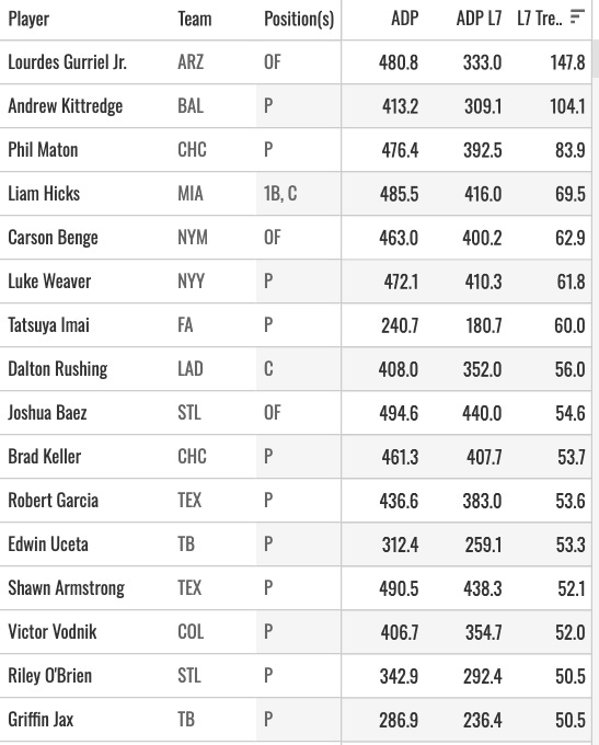 On the NFBC ADP Dashboard, you’ll find TREND DATA. That has been added recently. I look at L3 and L7 and compare that ADP with the full draft season’s worth of data. And then we see guys who are going in either direction. That dashboard is FREE. I also have some COMPETITION as other fantasy baseball publications have started their own ADP tools! So now it’s not enough to just have the thing, I have to be better than them. And that sucks. It’s better to not have competition. I mean, it’s way better for you, but it’s worse for me. I’d rather be the only one on the planet allowed to talk about fantasy baseball. Imagine the business I’d command.