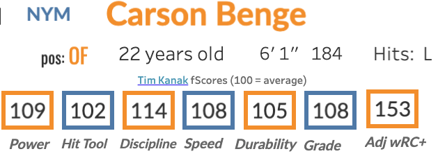 Carson Benge gets an upgrade since Brandon Nimmo has bounced out of town. There’s an OF spot open, which gives Benge a shot to be in the lineup earlier than we previously thought possible. He’s a 22-year-old prospect with big fScores: