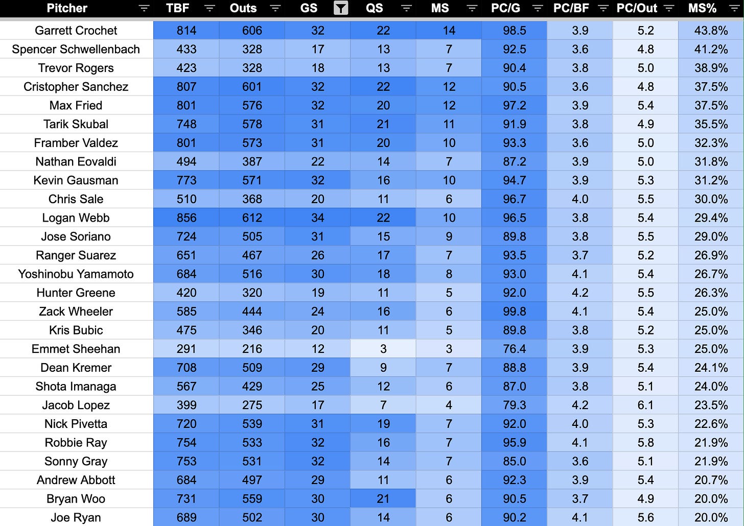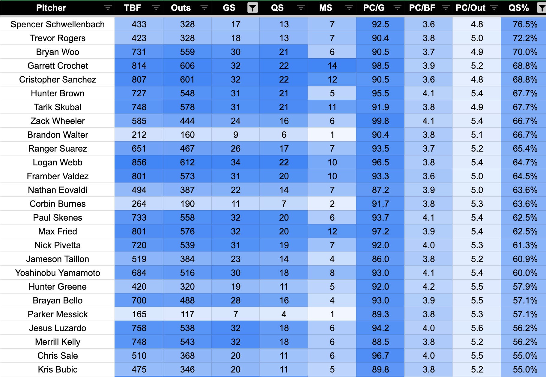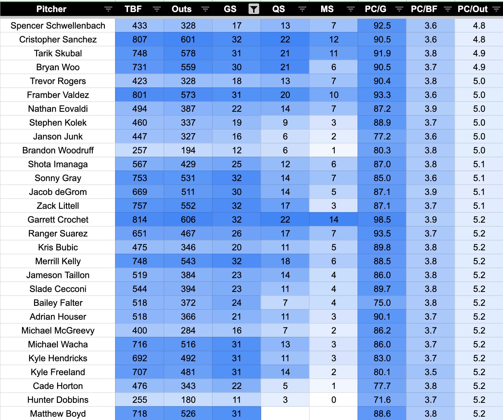 There’s a mix of good and bad pitchers on this list. One way to come up with a good PC/Out mark would just be to throw meatballs (we see you, Kyle Hendricks). Some guys know they won’t strike the guy out, so they just cut right to the chase and get a ball put in play quickly. And something like 70% of batted balls will turn into outs.