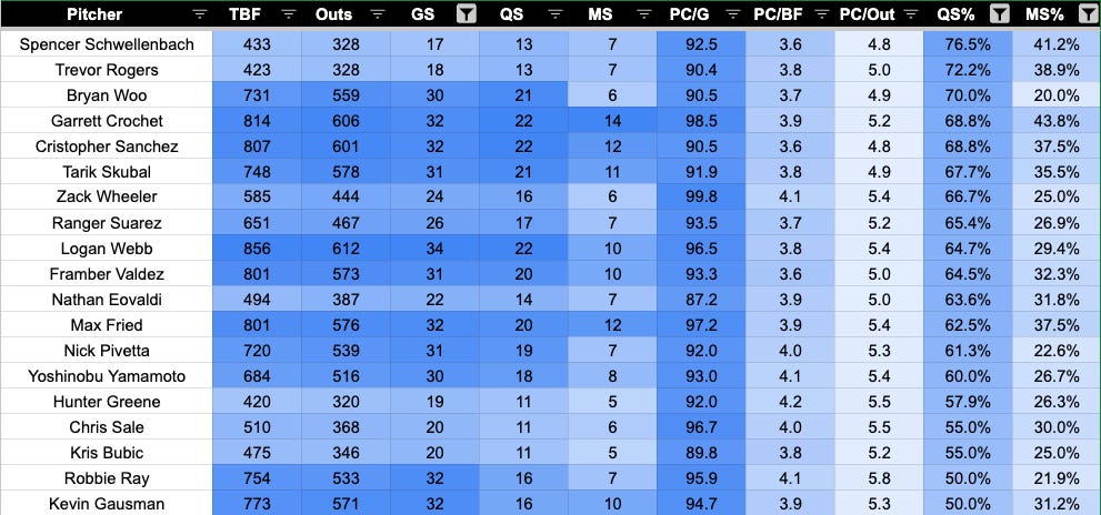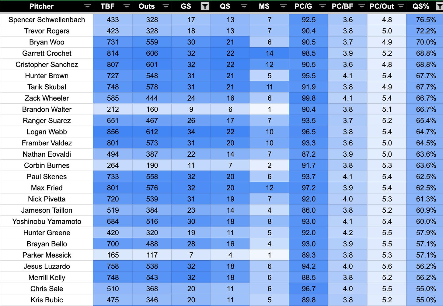 Trevor Rogers and Bryan Woo were the only other two to pull off 70%+. Woo filles up the zone with the best of them. He’s truly a one-of-a-kind pitcher. I’m fading him a bit at the ace cost because of health concerns, but there’s not a world where he goes out there as a healthy pitcher and doesn’t put up very strong WHIP and QS numbers.