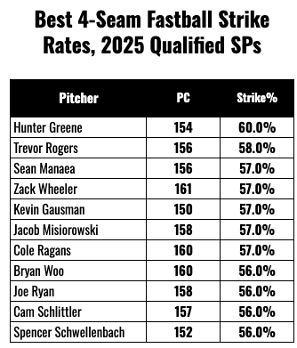 So the guys you really want to look at here are the ones who are also posting decent strikeout rates. And when you do that, not many surprise names remain. Brandon Woodruff was extremely good while healthy, but I don’t think he’ll be healthy much. Shota Imanaga can be quite efficient, but the strikeout ability really shrank in 2025, and this is another very high FB% guy. His ERA will suffer for that. Zack Littell gave up a ton of homers last year (1.74 HR/9), but he didn’t put many guys on base for free (4.2% BB%). He can get pretty deep into games and provide valuable starts to his teams when the ball stays in the confines. But I wouldn’t want to touch him for fantasy purposes with the 17% K%.
