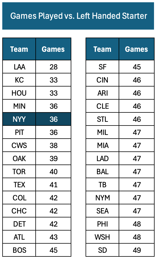 The Yankees did happen to tie for seeing the fourth-fewest left-handed starters in the league last year, so that worked against Goldy, but they’re likely to be closer to that big league average of 42.5 this year.