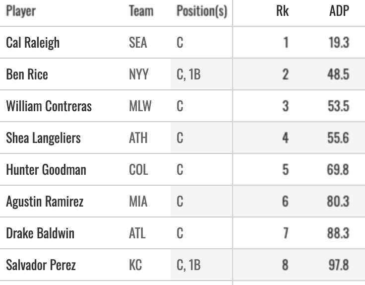 It’s nothing crazy. We can still easily see 135 starts for Rice, which is the norm for a true catcher (meaning a guy who doesn’t DH or play another position). But it does bring him to the table well short of the elite playing time guys at the position (Raleigh & Contreras).