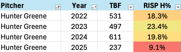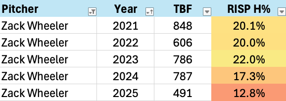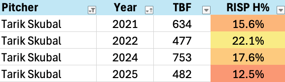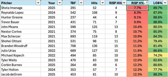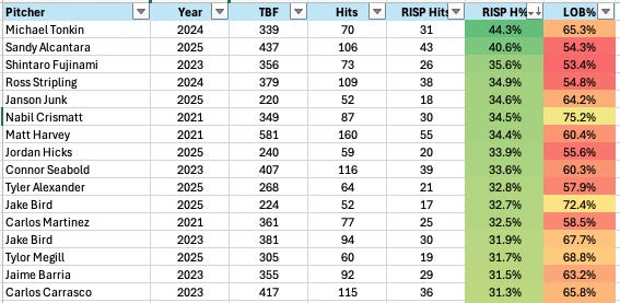 Since you’re seeing some stud names there, you might be tempted that indeed, the elite of the elite (deGrom, Skubal, Greene, Wheeler) might actually be able to really buckle when RISP and actually reliably put up a super low number here. But the data doesn’t show that: