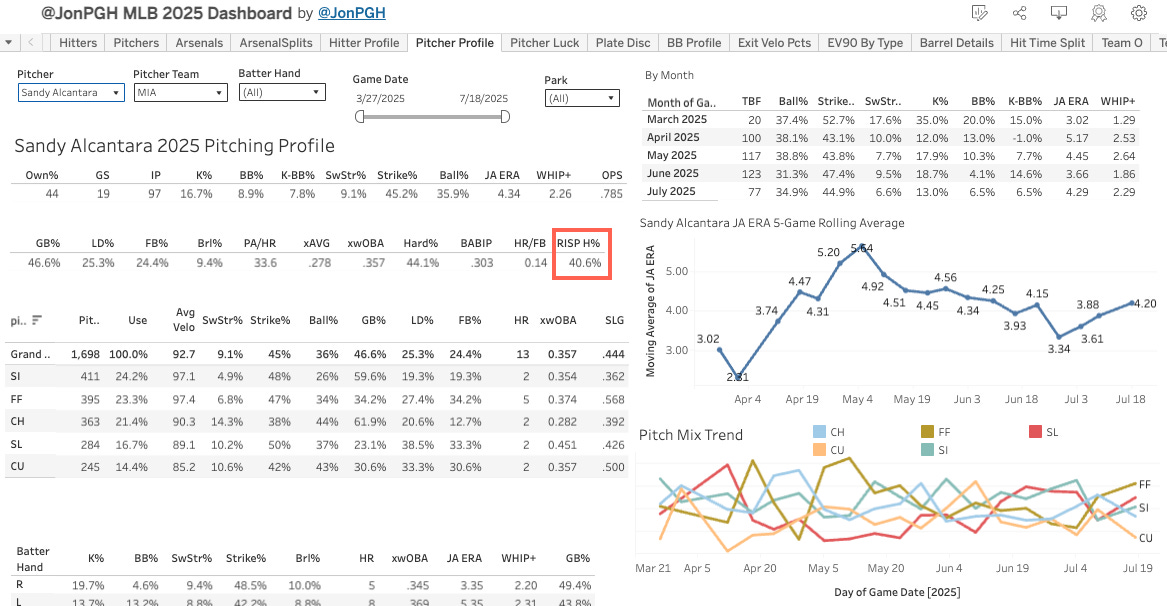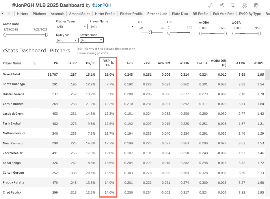 But it integrates really nicely into my dashboards, so I will be using it a lot as we go forward. You can find on the main dashboard (check the resource glossary for that link) on the Pitcher Luck tab and also the Pitcher Profile tab, and both will adjust to whatever parameters and filters you put on.