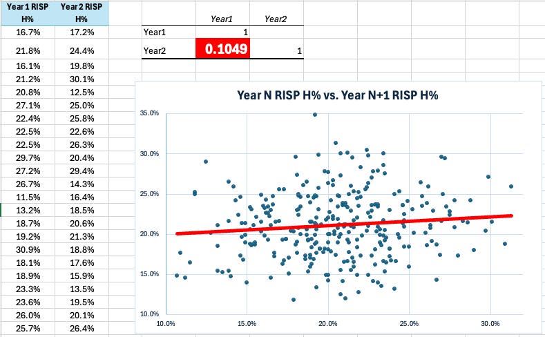 If pitcher a has a low RISP H% in year, does that mean that they’re more likely to have a low RISP H% the following year?