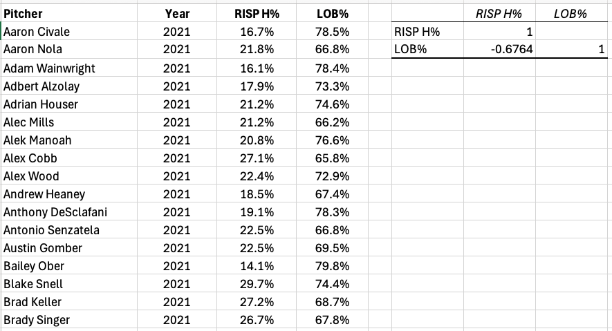 That shows a decently strong negative correlation between RISP H% and LOB%. Meaning that as LOB% goes up, you expect RISP H% to go down, but not every time, and not in a perfect relationship.