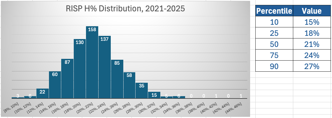 This shows you what is normal, what is high, and what is low. The average (50th percentile) we find is 21%. The three tallest bars there congregate right around 21%. This tells you that 425 of the 809 pitcher sample (53%) put up RISP H% values between 18% and 24%.