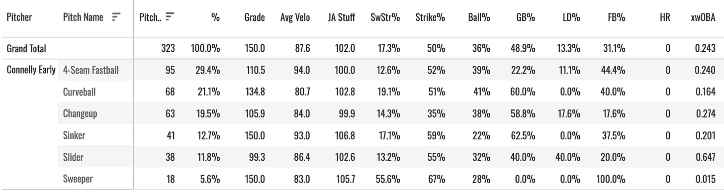 One guy that stood out while I was doing it was Connelly Early, but this shows you the small sample problem. Homey has a perfect 150 grade on his sinker!