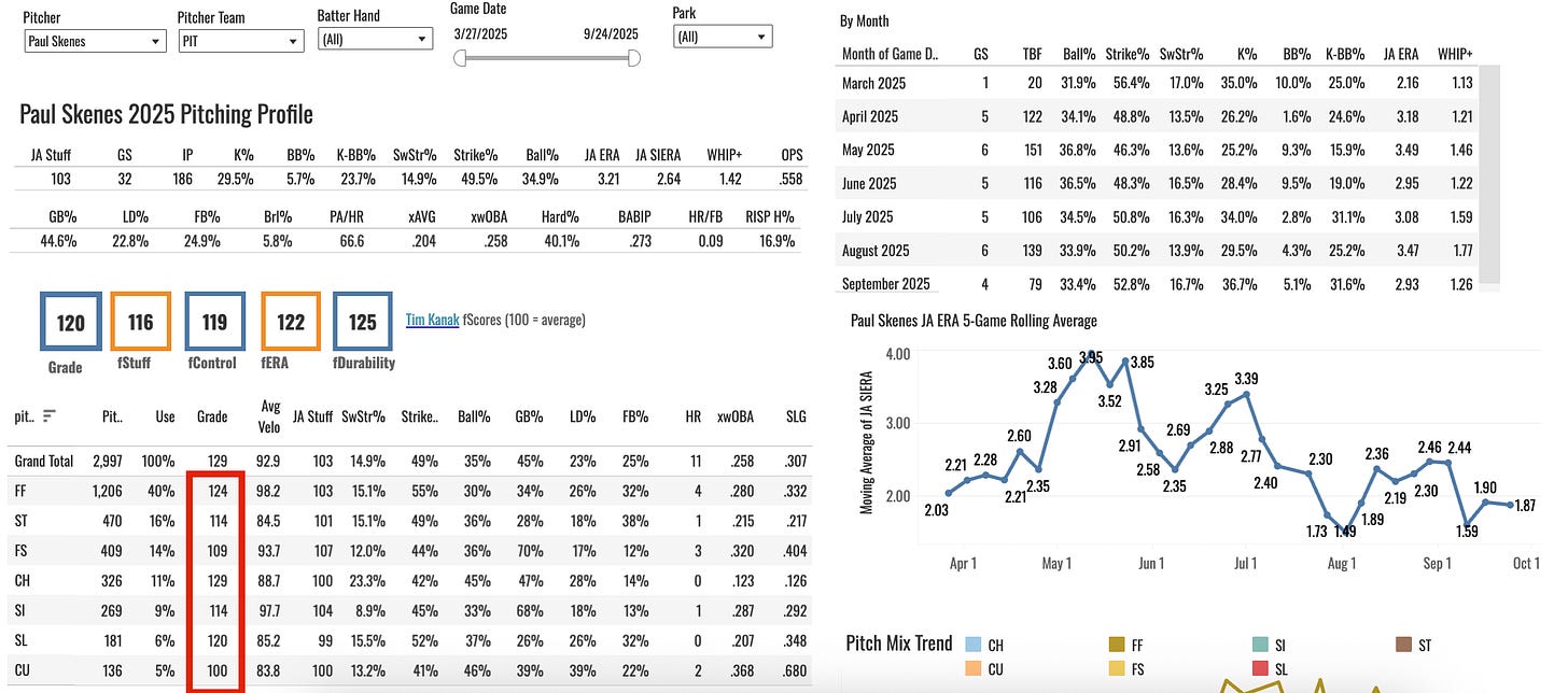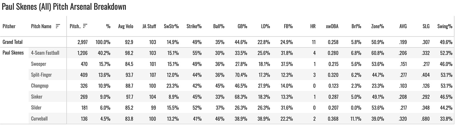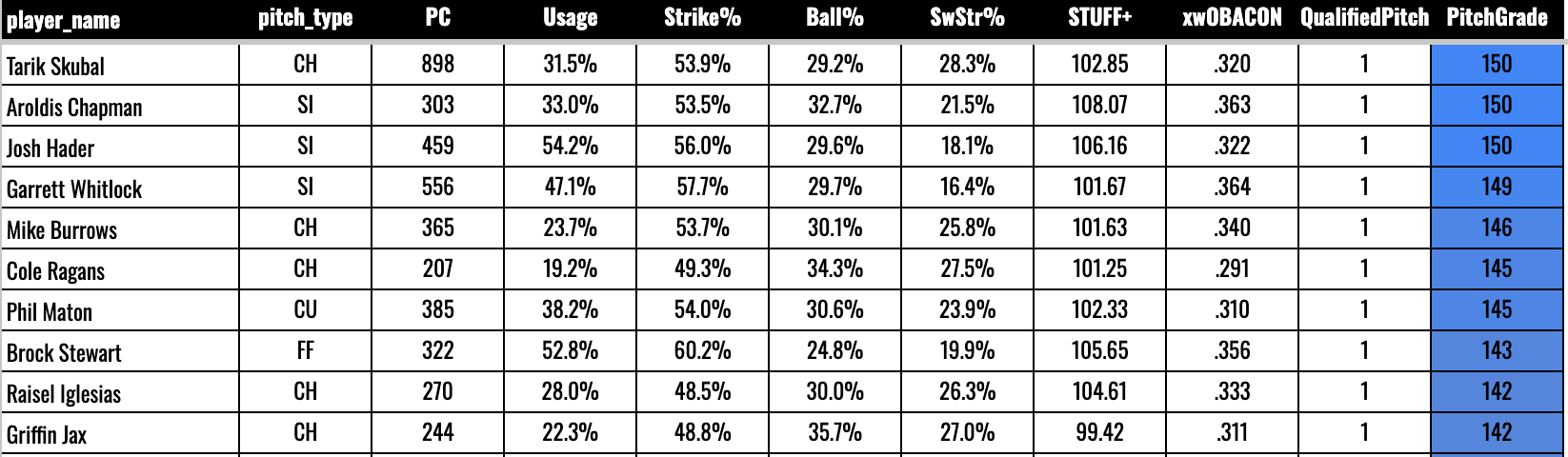 So it’s a results-based stat, besides the Stuff+ input. I think pitching analytics has gone way too far in ignoring actual results. You can have the world’s nastiest pitch, but if you can’t control it, it’s no good. So this stat accounts for both. It looks at everything that matters to me.