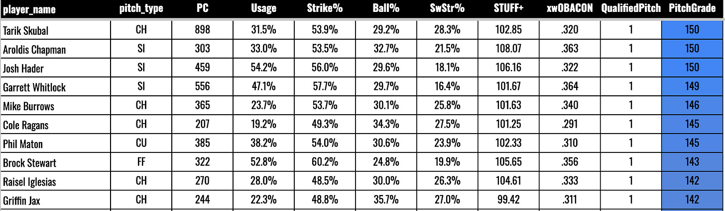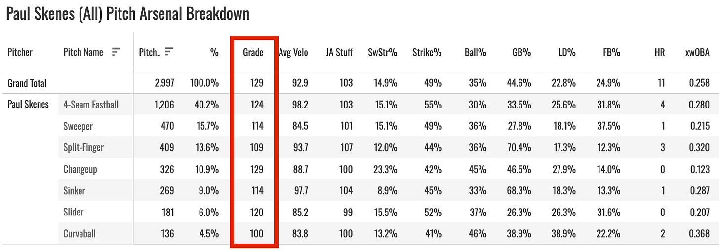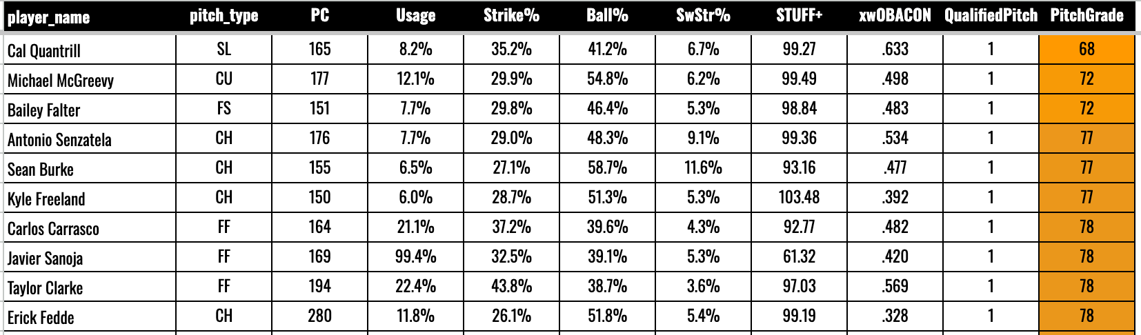 That means we have the small sample problem. The grades won’t “stabilize” until you’ve thrown at least a couple hundred of each pitch type.