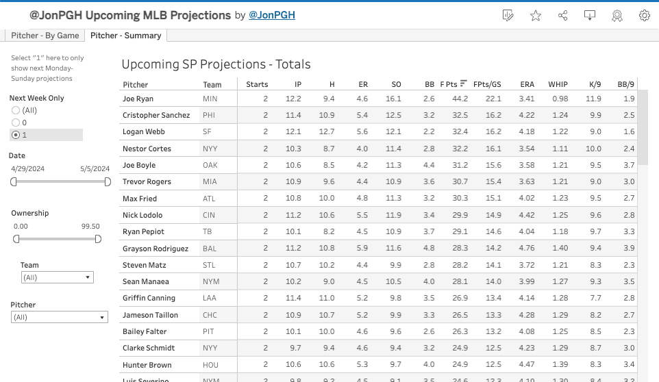 You can select a date range there to filter on whatever you want, it will never go out further than 10 days though. There’s a dropdown there for “Next Week Only”, and when you select “1” on that (I should change that “Y”, I think I will in the coming days), it will filter the data to only next Monday through next Sunday. Remember that this is only 10 days out, so you won’t be able to get the actual full next week projections until Friday. This is a resource best used on weekends when planning out your next week (the projected pitchers will improve in accuracy the closer you get to each day, obviously).