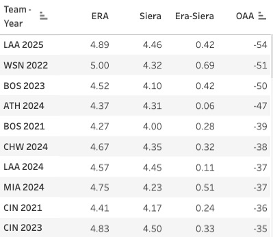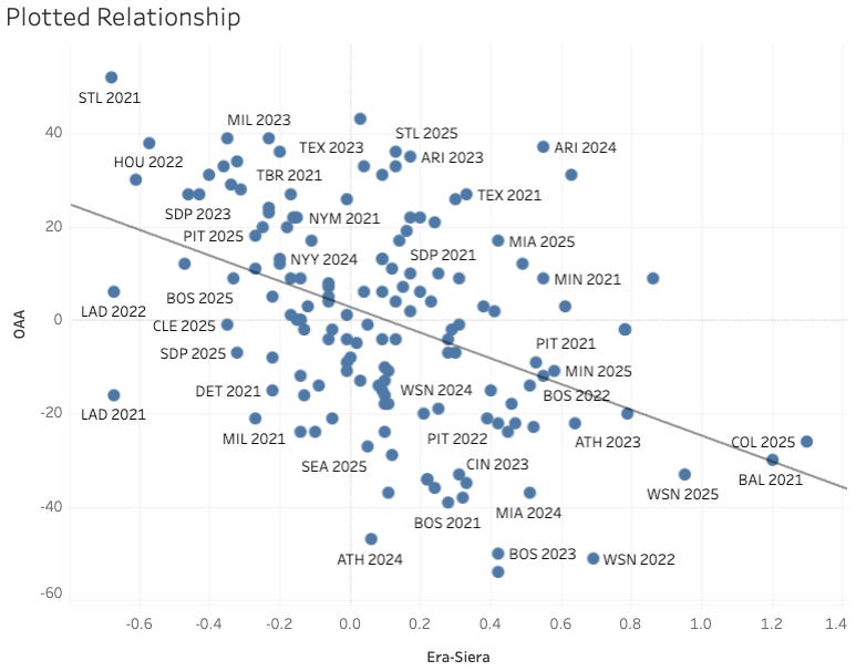 Bottom line: worse (higher) Era-SIERA is associated with worse (lower) OAA, but it’s only a moderate predictive link.