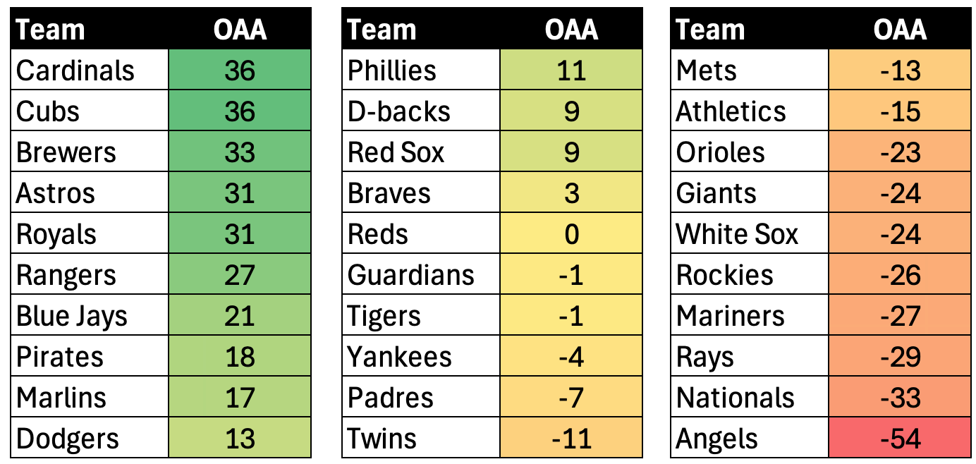 So the Cardinals and Cubs were the best defensive clubs, an incredible 90 runs above the worst unit over there in Anaheim.