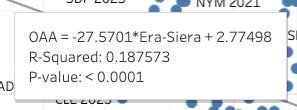 The R² = 0.188 means Era-SIERA explains about 19% of the variation in OAA — so there’s still a lot of scatter/noise from other factors.It’s statistically significant.