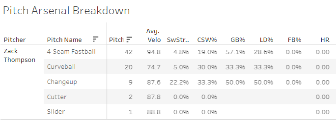 Nothing very impressive here, more than 50% on the four-seamer and bad marks on it. Curveball was bad in that start too. Even with the matchup against the Pirates, there’s a pretty good chance he comes in under 10 points which will kneecap your tournament lineup - but again, fine for a cash game lineup.