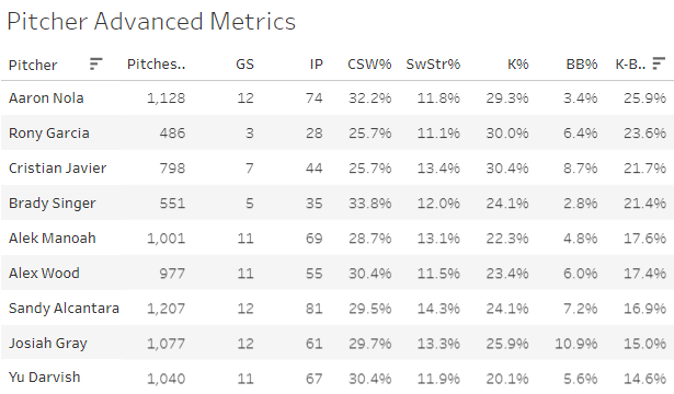 I think I’ll probably lean towards Nola in tournaments with the higher strikeout rate and the better matchup. Here are the K-BB marks for the top pitchers going today.