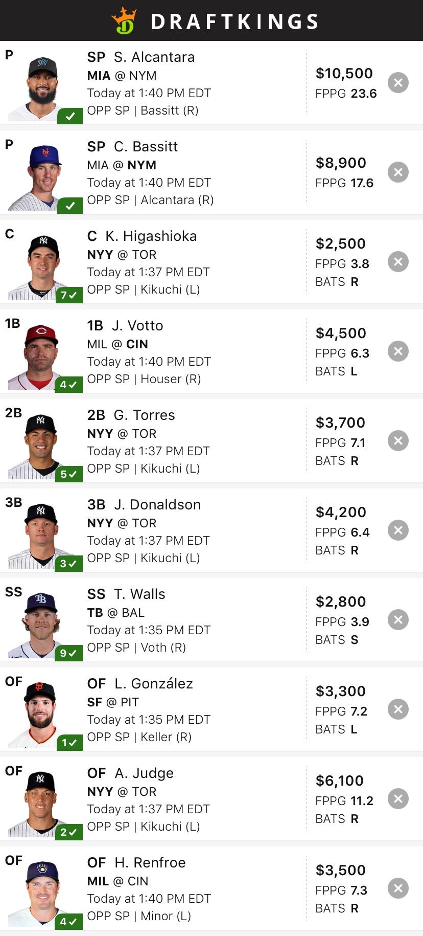 No cheap pitchers I feel good enough about so I paid up, we have these cheap Brewers to help out. Great spot for them in CIN against Minor. Couldnt quite get Cutch in there but $3,700 is about right for him anyways - so we will stick with Gonzalez and Renfroe in the OF as we get the whole way up to Judge.